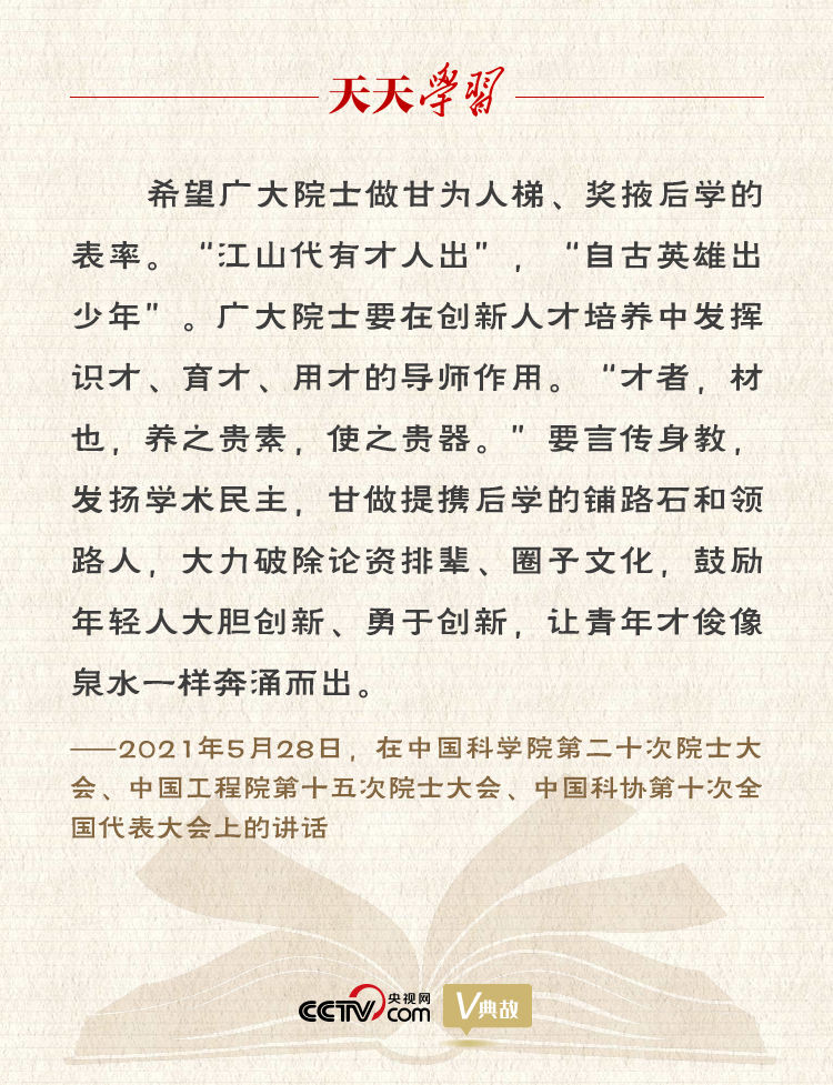 青年是祖國(guó)的前途、民族的希望、創(chuàng)新的未來(lái)。青年一代有理想、有本領(lǐng)、有擔(dān)當(dāng),科技就有前途,創(chuàng)新就有希望。在講話中,習(xí)近平總書(shū)記引用“才者,材也,養(yǎng)之貴素,使之貴器”這句古語(yǔ),希望廣大院士關(guān)心和愛(ài)護(hù)青年人才,把發(fā)現(xiàn)、培養(yǎng)青年人才作為一項(xiàng)重要責(zé)任,為青年人才施展才干提供更多機(jī)會(huì)和更大舞臺(tái)。