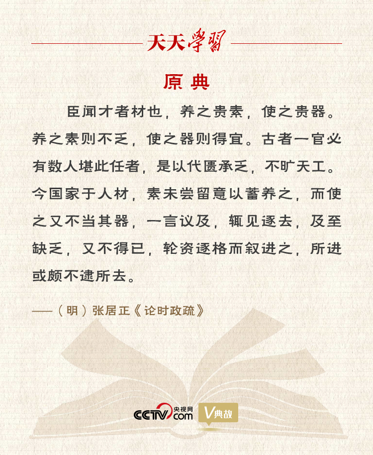 明嘉靖二十八年(1549年),時(shí)年25歲的翰林院庶吉士張居正向嘉靖皇帝上《論時(shí)政疏》,提出改革政治的主張。《論時(shí)政疏》列舉了當(dāng)時(shí)政治危機(jī)中最迫切的宗室、人才、官吏、外患、財(cái)政五大問(wèn)題。其中關(guān)于人才問(wèn)題,張居正指出,“才者,材也,養(yǎng)之貴素,使之貴器”。意思是人才就像木材一樣,培養(yǎng)時(shí)貴在保持其本性,使用時(shí)貴在發(fā)揮其特長(zhǎng)。