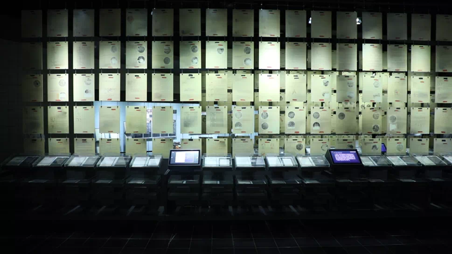 侵華日軍第七三一部隊罪證陳列館人體實驗展區(qū),一張張英文人體實驗報告書復(fù)印件,連成一面墻。新華社記者 何山 攝