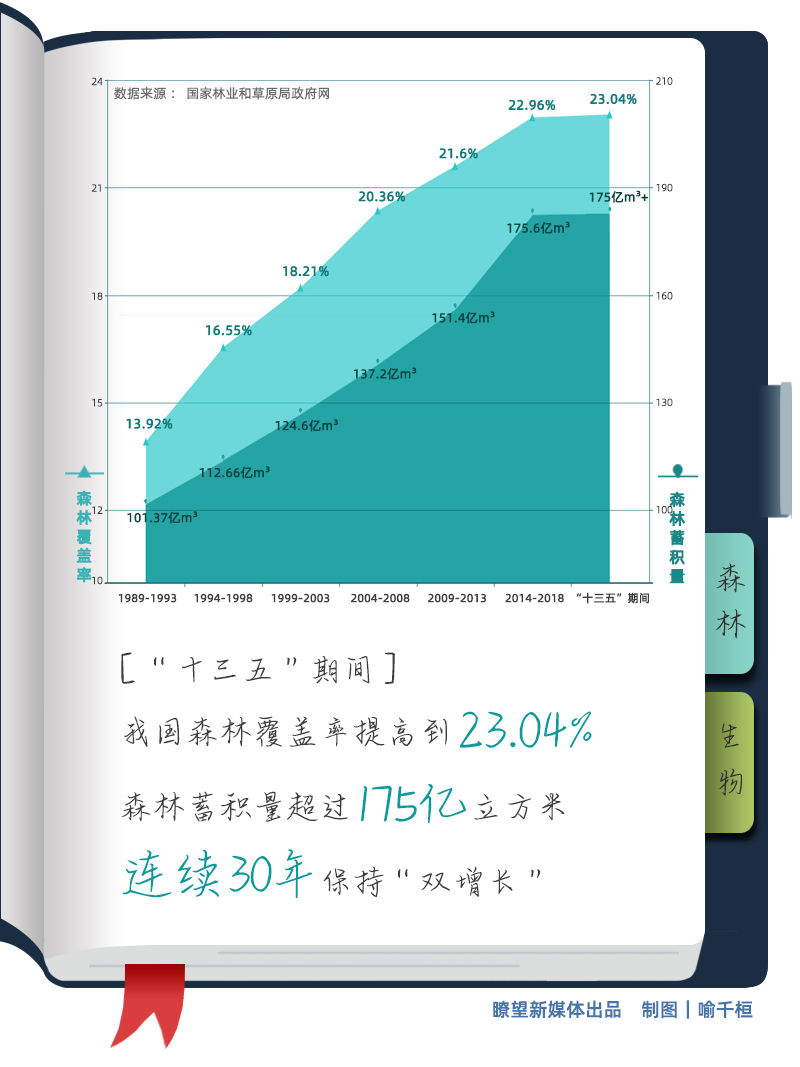 三北防護(hù)林、天然林保護(hù)、退耕還林還草等一系列重大生態(tài)工程深入推進(jìn)!笆濉逼陂g,我國森林覆蓋率提高到23.04%,森林蓄積量超過175億立方米,連續(xù)30年保持“雙增長”,成為森林資源增長最多的國家。