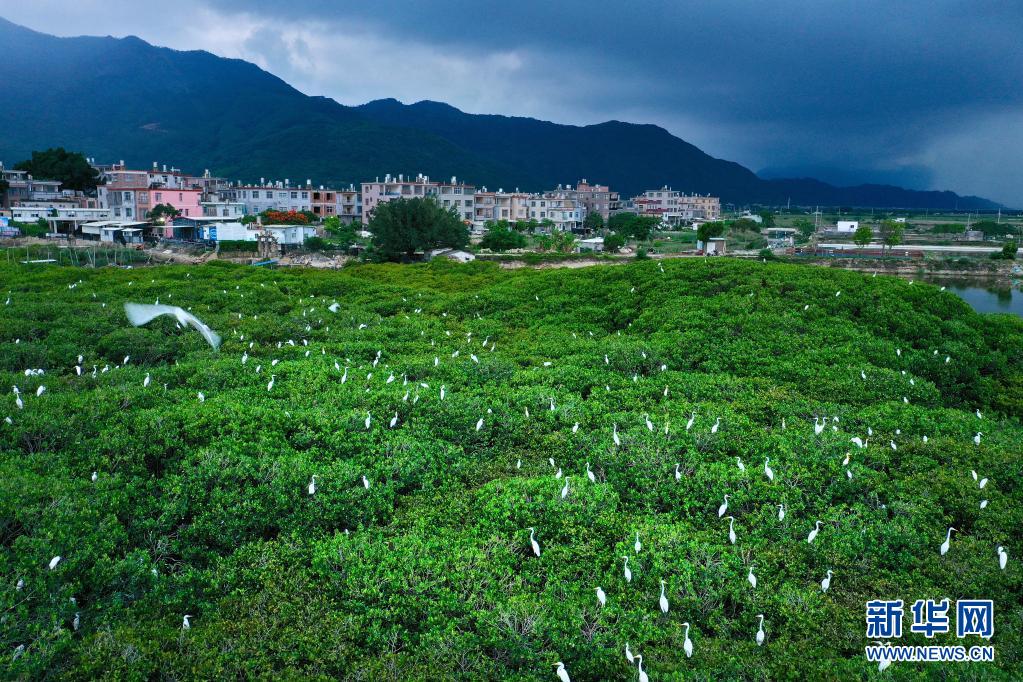 6月4日,福建漳江口紅樹林國家級自然保護(hù)區(qū)內(nèi)棲息繁衍的鷺鳥與不遠(yuǎn)處的村莊形成人與自然和諧景觀(無人機(jī)照片)。