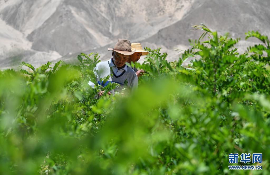山南市貢嘎縣吉雄鎮(zhèn)劉瓊村村民在檢查樹苗生長情況(6月2日攝)。新華社記者 晉美多吉 攝