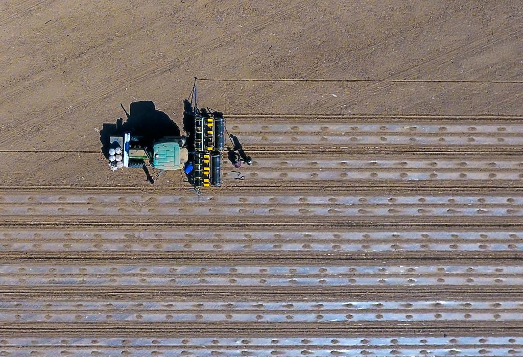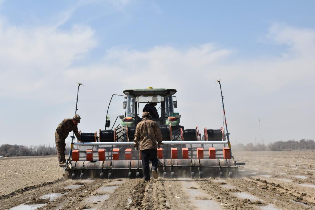 兵團職工朱勇強(中)在辣椒播種機后查看播種效果(2020年3月28日攝)。新華社記者 高晗 攝