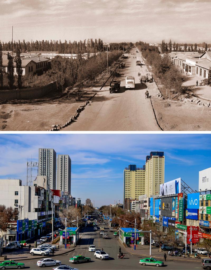 拼版照片:上圖為上世紀50年代初期的石河子新城街道北子午路(新疆兵團農(nóng)墾博物館提供)。下圖為2019年4月9日拍攝的同路段街景。新華社記者 王菲 攝