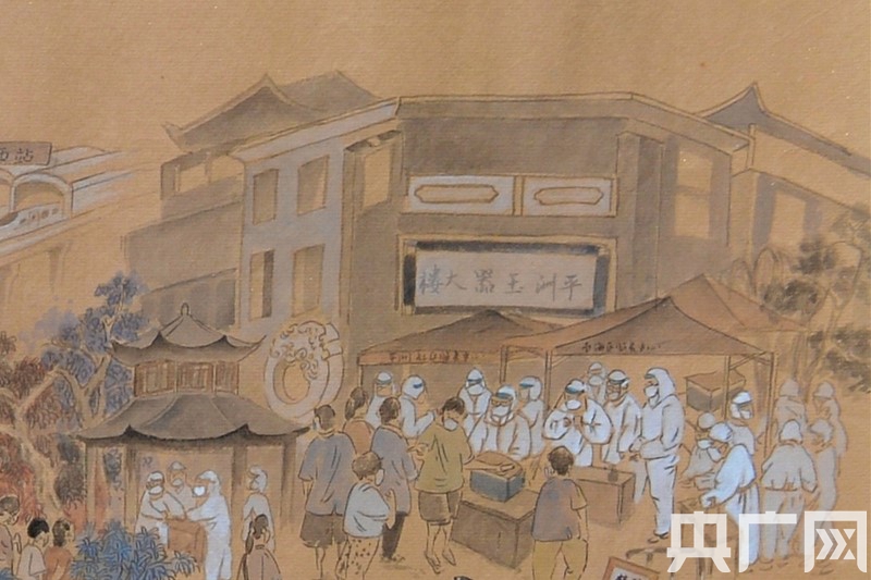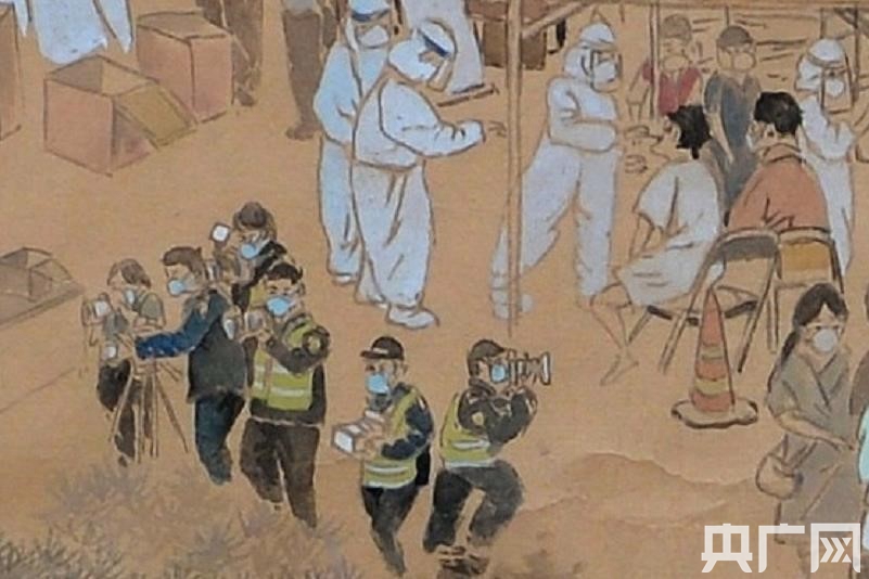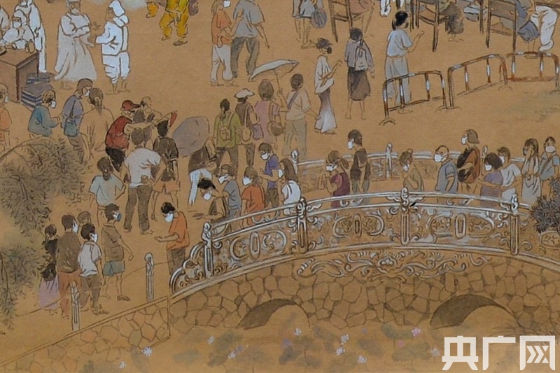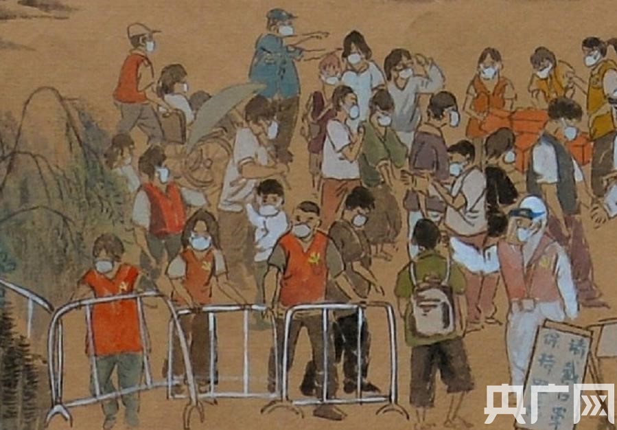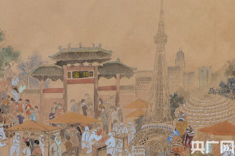 畫卷的整體風格延續(xù)了《清明上河圖》的表現(xiàn)手法,大到西樵山、佛山祖廟、嶺南明珠體育館、佛山西站等地標,小到帶著口罩排隊的居民、身著防護服的醫(yī)務人員、穿起紅色馬甲的志愿者、全副武裝的消毒人員,甚至扛著長槍短炮的新聞記者也躍然紙上。