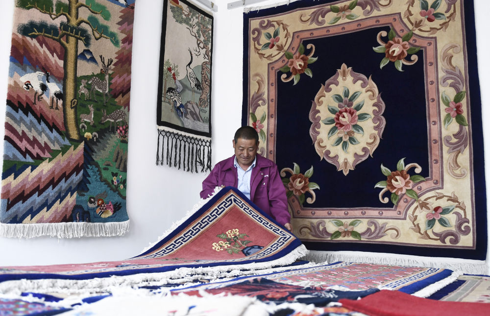 ↑6月5日,在西寧市湟中縣加牙村,國家級非物質(zhì)文化遺產(chǎn)項(xiàng)目加牙藏族織毯技藝傳承人楊永良在整理制作好的藏毯。