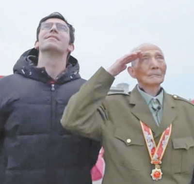 高佑思(左)與軍醫(yī)老爺爺在天安門(mén)廣場(chǎng)一同觀看升旗儀式。