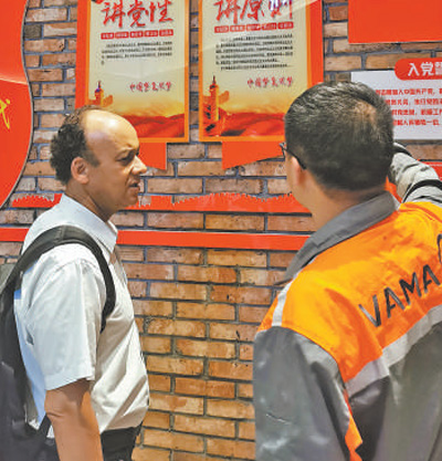VAMA公司黨員為喬治講解“不忘初心、牢記使命”主題教育相關(guān)內(nèi)容。 資料圖片