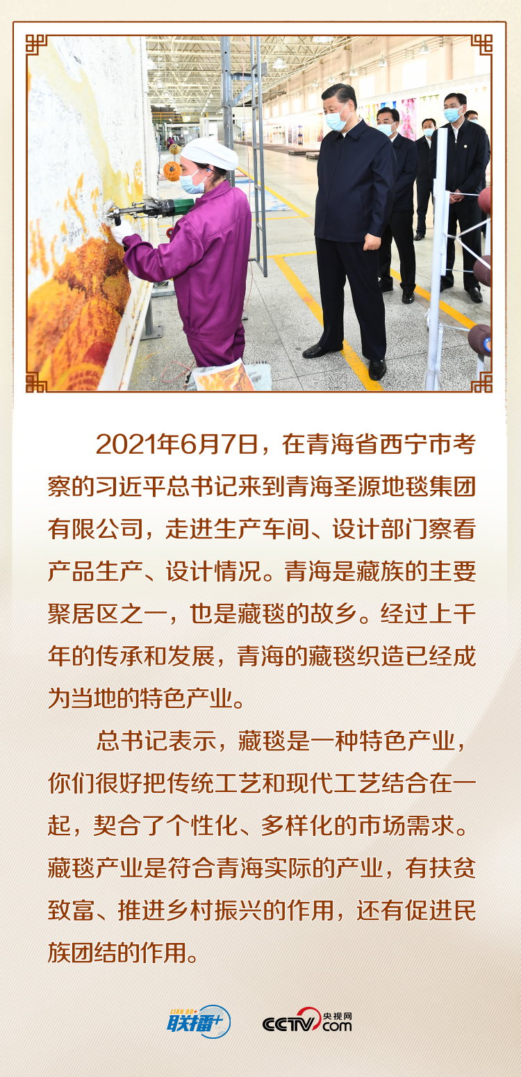 聯(lián)播+6月7日下午,在青海省西寧市考察的習近平總書記來到青海圣源地毯集團有限公司,走進生產(chǎn)車間、設計部門察看產(chǎn)品生產(chǎn)、設計情況。青海是藏族同胞的主要聚居區(qū)之一,也是藏毯的故鄉(xiāng)。經(jīng)過上千年的傳承和發(fā)展,青海的藏毯織造已經(jīng)成為當?shù)氐奶厣a(chǎn)業(yè)。在這里,總書記為藏毯織造這一傳統(tǒng)工藝點贊,并希望青海發(fā)展更多這樣的特色產(chǎn)業(yè),靠創(chuàng)新實現(xiàn)更好發(fā)展。