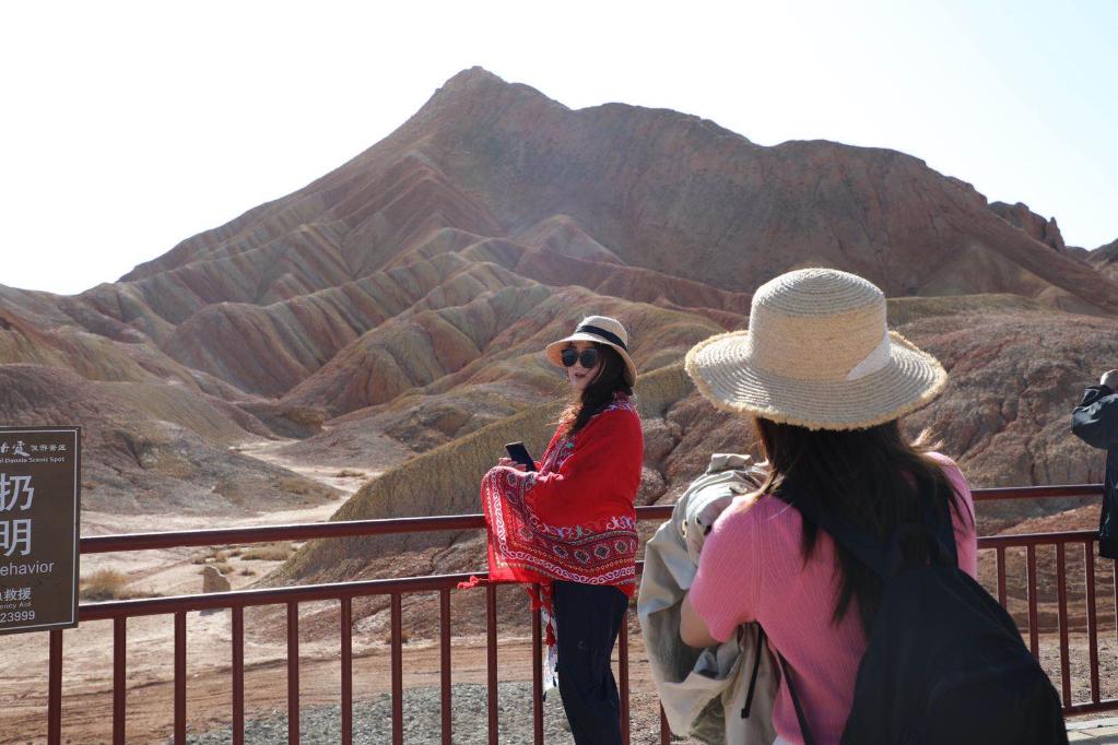 游客在張掖七彩丹霞景區(qū)拍照留念。新華社記者李杰攝