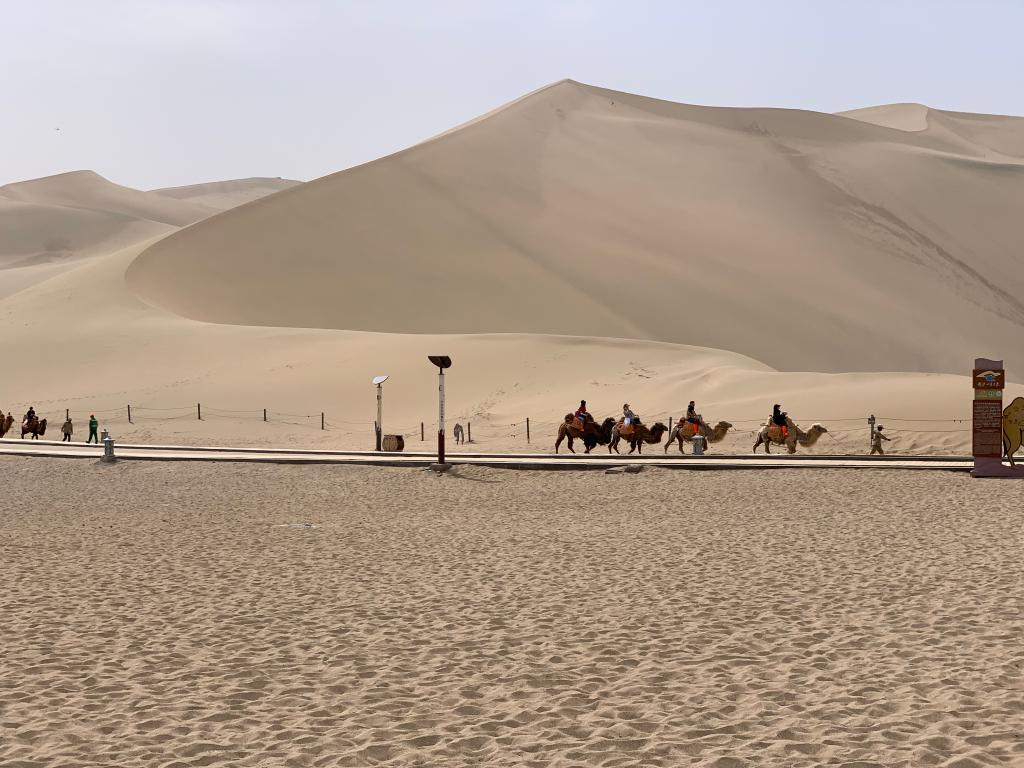 敦煌鳴沙山月牙泉景區(qū)內(nèi),游客騎著駱駝感受沙漠之美。新華社記者李杰攝