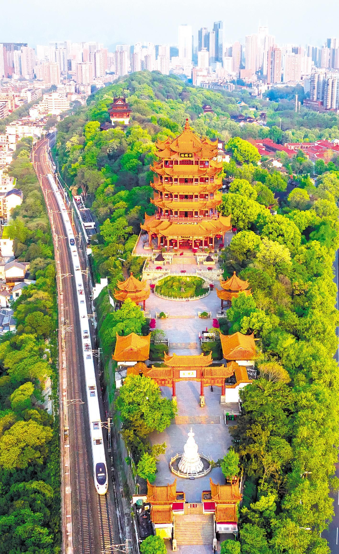 2020年4月12日,武漢市武昌蛇山上春意盎然,一列動車組從黃鶴樓旁邊經(jīng)過。 湖北日報全媒記者 陳勇 攝