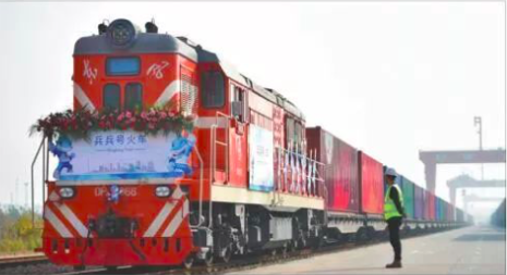 2018年,中歐(武漢)班列軍運會主題列車“兵兵號”從武漢臨空港經(jīng)濟(jì)技術(shù)開發(fā)區(qū)(東西湖區(qū))中鐵聯(lián)集武漢中心站發(fā)車,沿著“絲路”大通道,駛向德國漢堡。圖片來源:人民日報