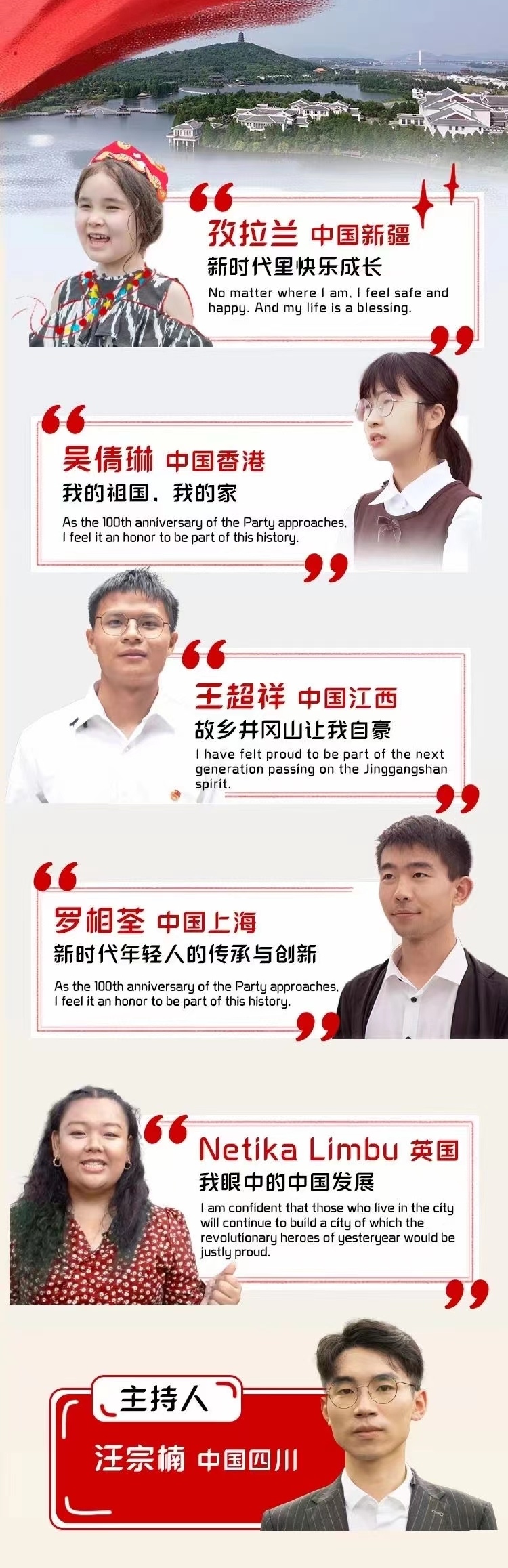 來自新疆伊犁的5歲小朋友孜拉蘭、中國香港的14歲中學生吳倩琳、江西吉安的17歲高中生王超祥、江西南昌的21歲大學生羅相荃、英國沃里克郡的23歲留學生內提卡·林布,分享了自己眼中新時代中國發(fā)展成就和中國共產黨百年歷程,以及青少年如何為國家和世界發(fā)展而奮斗的理想和情懷。