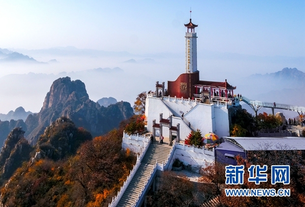 這是狼牙山棋盤陀峰頂的“狼牙山五勇士紀念塔”(2017年10月27日無人機拍攝)。新華社發(fā)