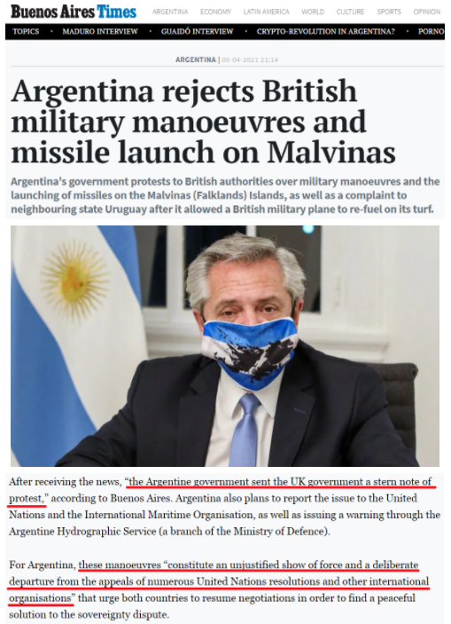 △《布宜諾斯艾利斯時報》報道截圖(題圖為阿根廷總統(tǒng)費爾南德斯戴著印有阿根廷國旗顏色和馬爾維納斯群島地圖的口罩)