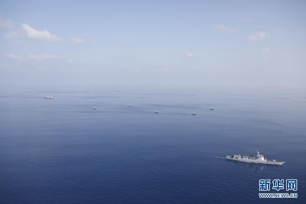 中國海軍第37批護航編隊在亞丁灣海域為中國“滬漁1715”船隊伴隨護航(4月23日攝)。