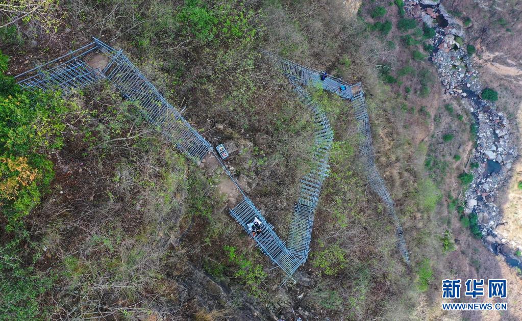 在四川省涼山彝族自治州昭覺縣阿土列爾村的懸崖鋼梯上,村民沿著鋼梯下山(2020年5月13日攝,無人機(jī)照片)。新華社記者 王曦 攝