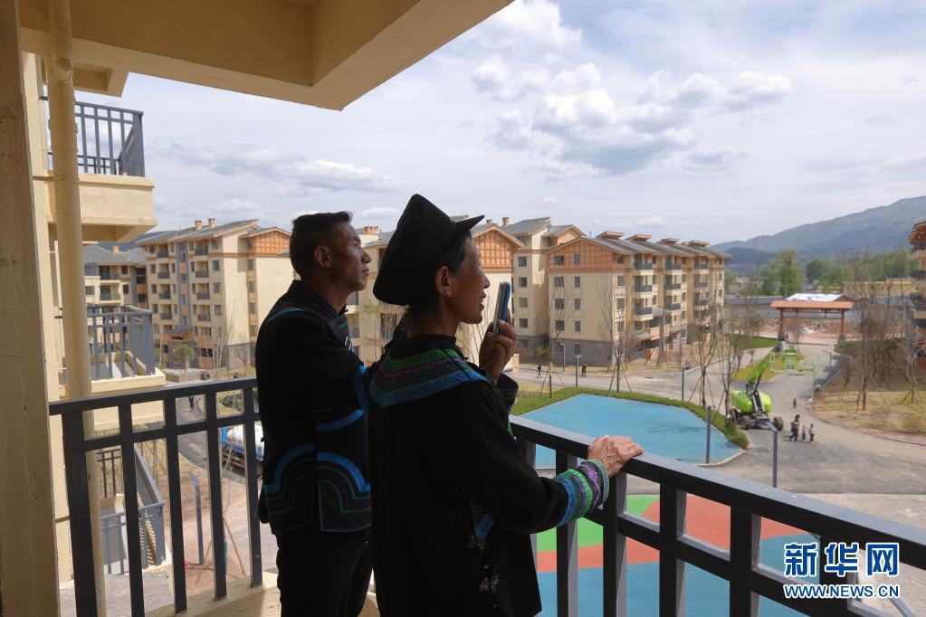 在四川省昭覺縣城易地扶貧搬遷安置點(diǎn)南坪社區(qū),剛搬遷到新家的“懸崖村”村民莫色達(dá)體夫婦在陽臺給親戚打電話(2020年5月13日攝)。新華社記者 江宏景 攝