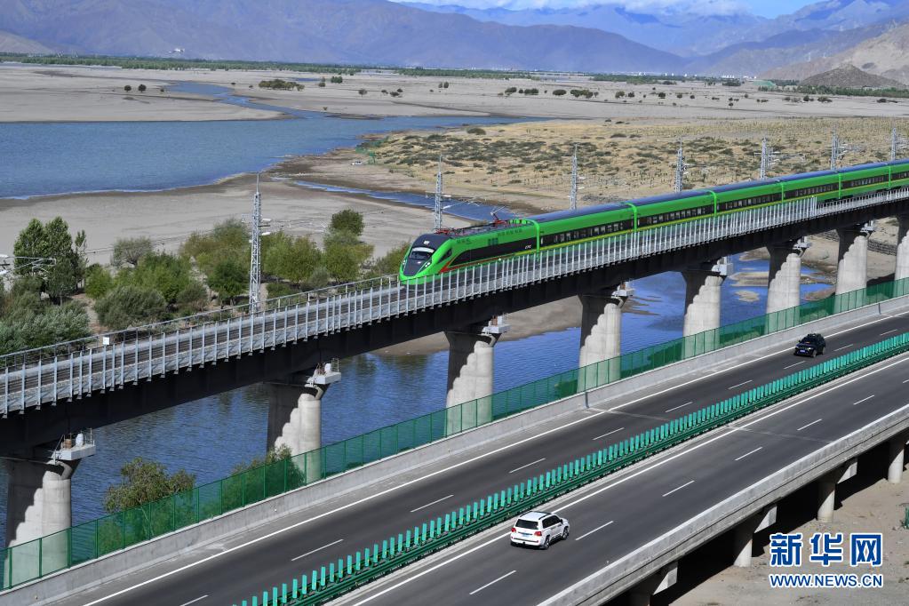 試運(yùn)行的復(fù)興號列車行駛在雅魯藏布江畔(6月16日攝)。新華社記者 覺果 攝