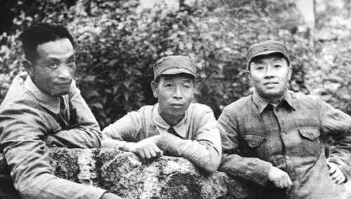 圖為王諍(左)、劉寅(右)和1932年在鄂豫皖蘇區(qū)抄收過紅中社新聞的王子綱(資料照片)。新華社發(fā)