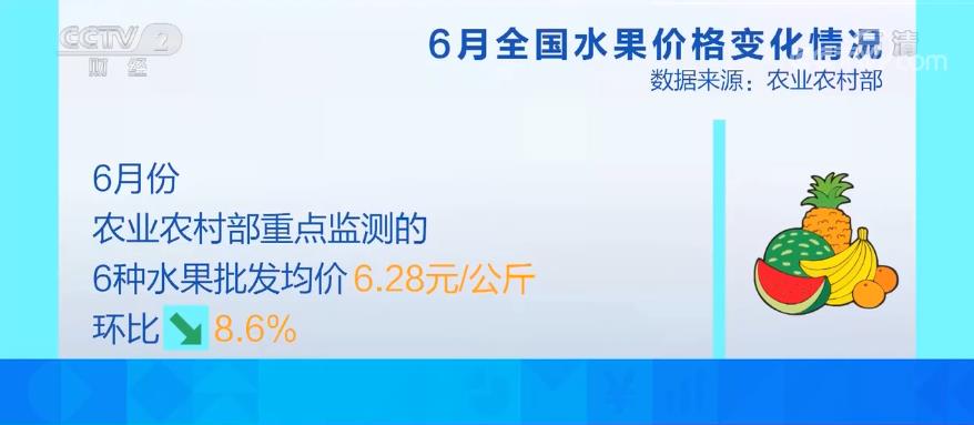 數(shù)據(jù)顯示,6月份農(nóng)業(yè)農(nóng)村部重點監(jiān)測的6種水果批發(fā)均價每公斤6.28元,環(huán)比下降8.6%。