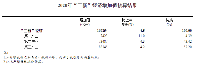 2020年,盡管受到突如其來的新冠肺炎疫情的巨大沖擊和嚴(yán)峻復(fù)雜國際形勢的影響,我國新產(chǎn)業(yè)新業(yè)態(tài)新商業(yè)模式仍繼續(xù)保持增長。經(jīng)核算,2020年我國“三新”經(jīng)濟(jì)增加值為169254億元,比上年增長4.5%(未扣除價(jià)格因素,下同),比同期國內(nèi)生產(chǎn)總值(GDP)現(xiàn)價(jià)增速高1.5個(gè)百分點(diǎn);相當(dāng)于GDP的比重為17.08%,比上年提高0.7個(gè)百分點(diǎn)。