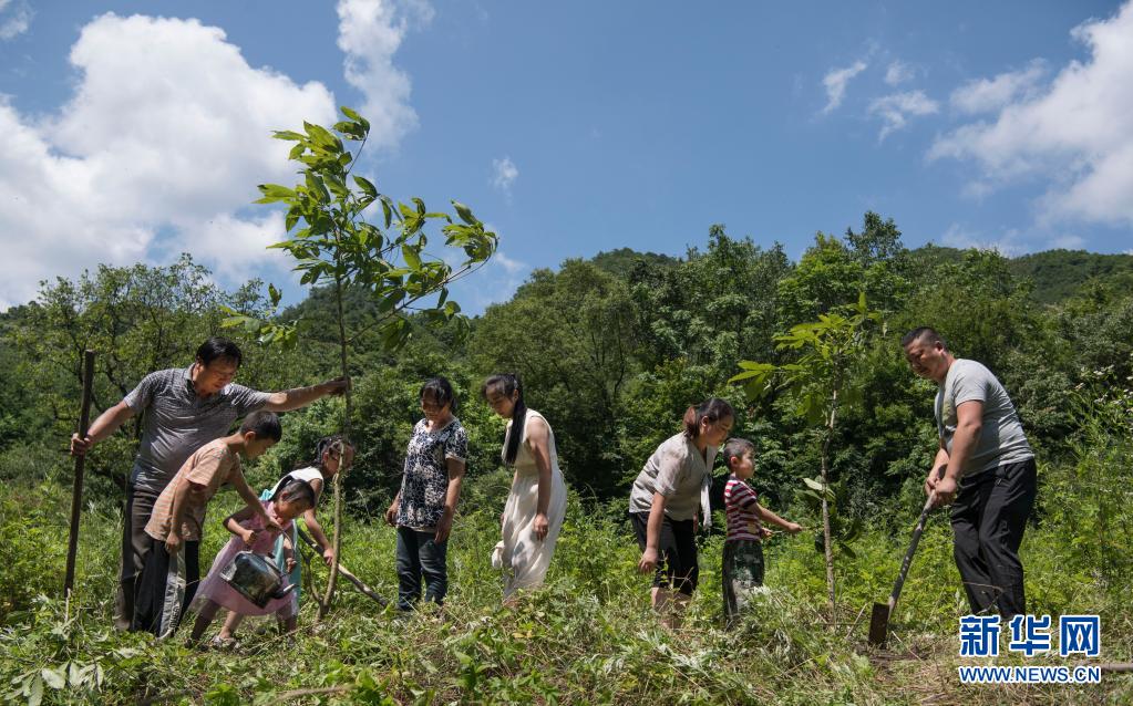姚祖元(右一)與家人一起種樹(shù)(2019年7月13日攝)。在秦嶺深處的陜西省漢中市留壩縣火燒店鎮(zhèn),姚家五代人歷時(shí)70年深耕秦嶺的故事在當(dāng)?shù)丶矣鲬魰,傳為佳話。新華社記者 陶明 攝