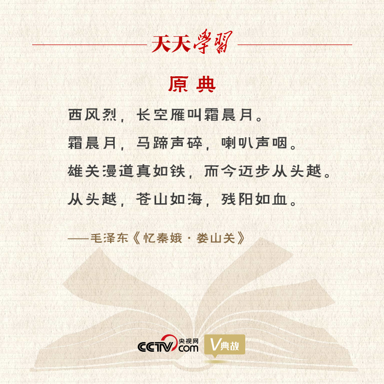 《憶秦娥·婁山關(guān)》創(chuàng)作于1935年2月,為毛澤東長征途中指揮中央紅軍攻克婁山關(guān)后所作。其下闋以“雄關(guān)漫道真如鐵,而今邁步從頭越”開頭,語調(diào)雖比較舒緩,但“真如鐵”三字突出了紅軍闖關(guān)奪隘的艱辛。通過“鐵”這一物象的堅硬、沉重,藝術(shù)性地把奪取雄關(guān)的艱辛具體化、形象化;同時“漫道”二字又透出藐視艱辛的豪邁情懷。漫道:莫說,不要講。“雄關(guān)漫道真如鐵”意思是不要說婁山關(guān)堅實如鐵!岸襁~步從頭越”是上句的自然延伸。邁步:舉大步。經(jīng)過戰(zhàn)斗雄關(guān)已成通途,現(xiàn)在要從頭大踏步越過雄關(guān)。不僅抒寫了人民必勝的信心,而且對困難的鄙夷與蔑視也躍然紙上。
