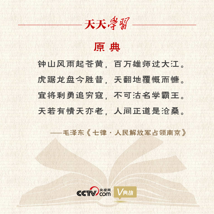 1949年4月21日,人民解放軍百萬大軍橫渡長江,4月23日一舉攻克國民黨盤踞22年的統(tǒng)治中心南京。毛澤東在北平西郊香山的雙清別墅得知消息后興奮異常,即興賦成《七律·人民解放軍占領(lǐng)南京》。其尾聯(lián)“天若有情天亦老,人間正道是滄!,包含毛澤東對歷史的慨嘆和思考。上句借用唐代詩人李賀《金銅仙人辭漢歌》的成句,意思是天是自然之物,然而長期見證歷史變遷,也會對人類社會翻天覆地的變化產(chǎn)生某種情感反應(yīng);下句對人間正在行進著的歷史車輪無可阻擋的滄桑巨變,抒發(fā)無限感慨。