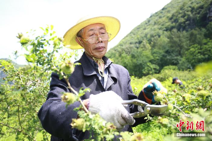 野鐘鄉(xiāng)野鐘村村民唐召良正在地里修剪刺梨多余的枝葉。這位有著43年從醫(yī)經(jīng)驗的鄉(xiāng)村醫(yī)生,在退休之后,放下聽診器,拿起了修枝剪!耙郧胺N玉米,2015年開始種刺梨,現(xiàn)在我有15畝地,種刺梨的收入是種玉米的3倍!”