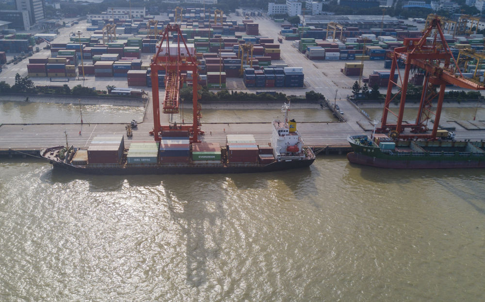 2021年6月3日,集裝箱貨輪?吭谥袊ǜ=ǎ┳杂少Q(mào)易試驗區(qū)福州青州集裝箱碼頭(無人機(jī)照片)。新華社記者 宋為偉 攝