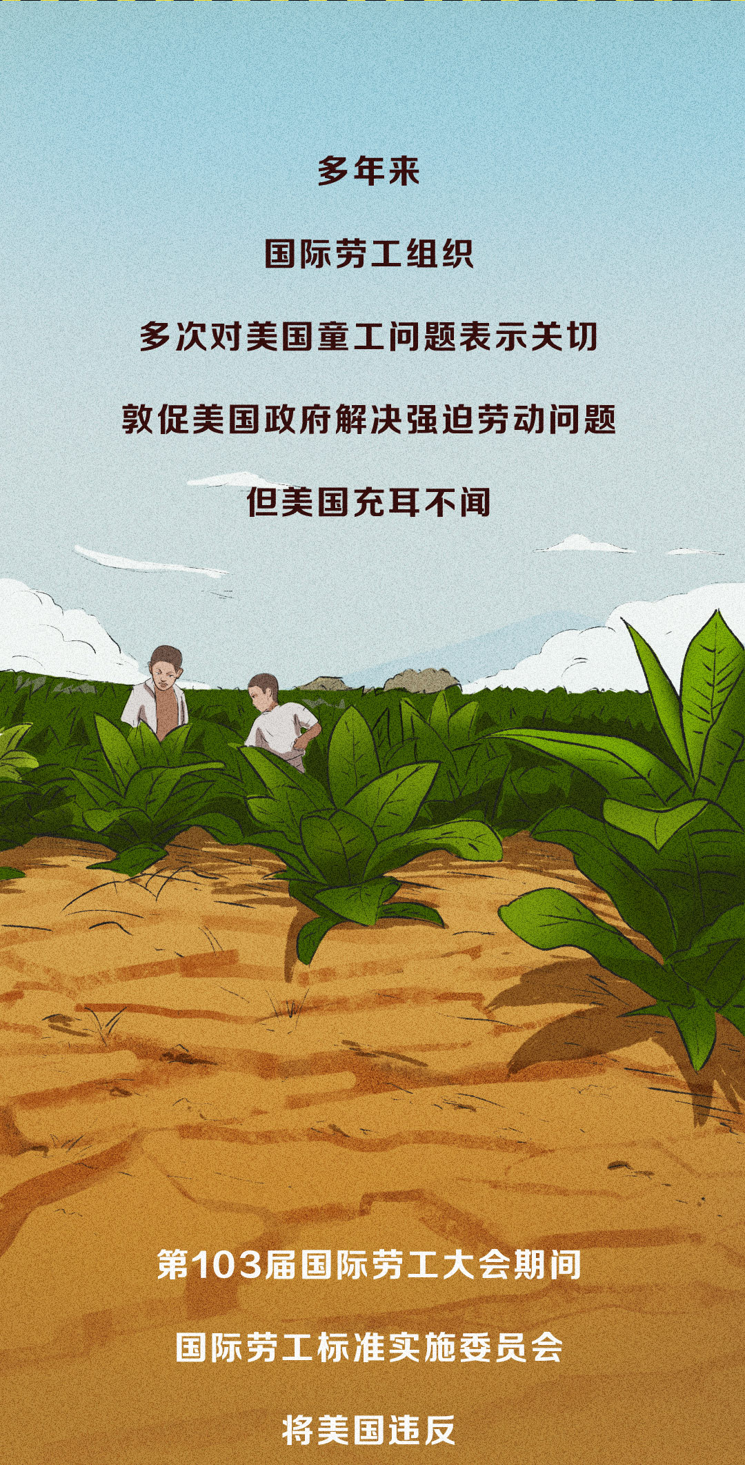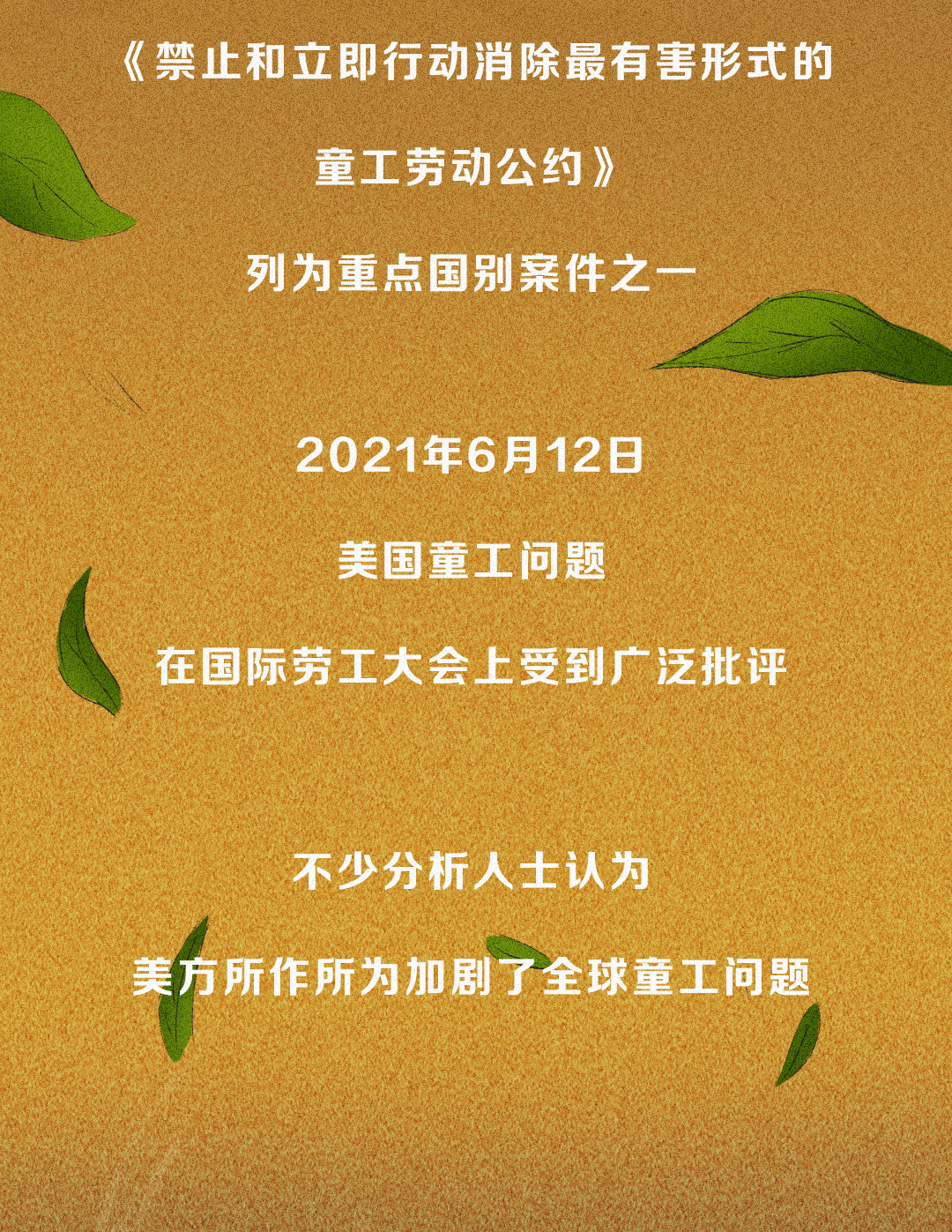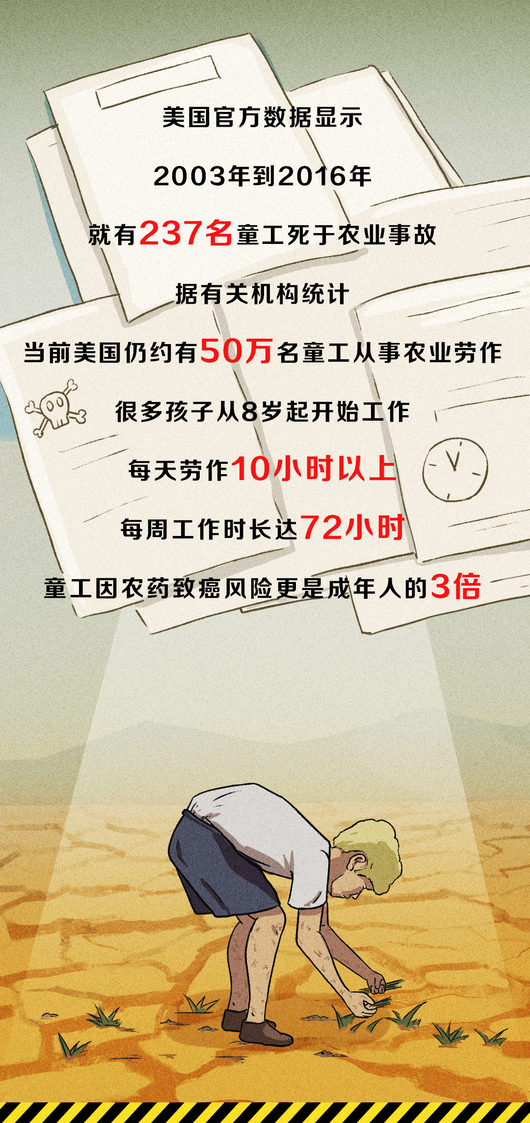近日,國(guó)際勞工組織和聯(lián)合國(guó)兒童基金會(huì)最新報(bào)告揭露全球童工人數(shù)在今年出現(xiàn)了近20年來(lái)的首次反彈,據(jù)有關(guān)機(jī)構(gòu)統(tǒng)計(jì),高呼人權(quán)至上的美國(guó)竟有約50萬(wàn)名童工。一圖了解美國(guó)童工問(wèn)題。