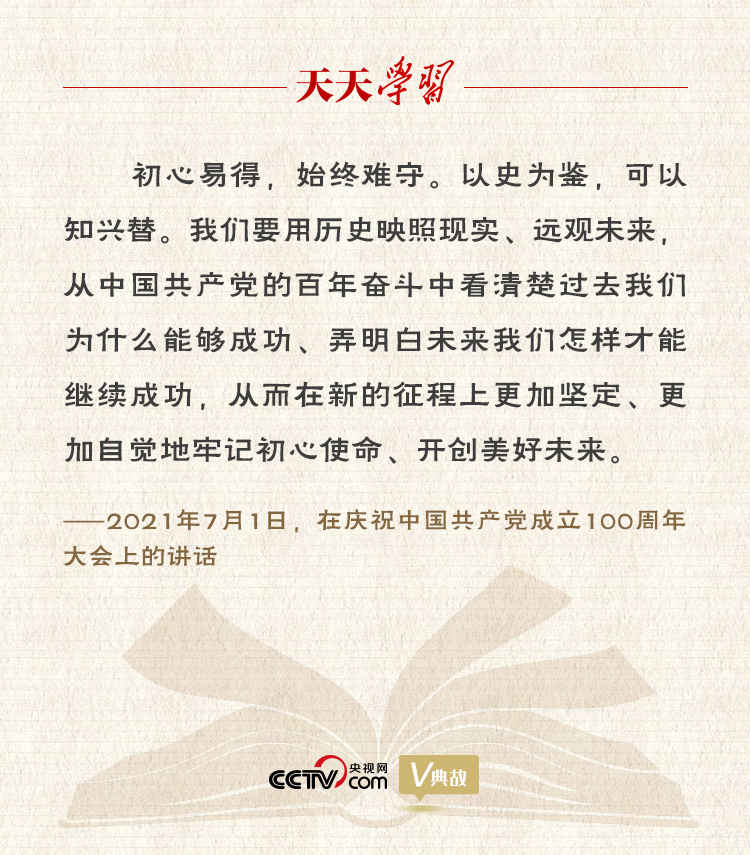 以史為鑒,可以知興替。在慶祝中國共產(chǎn)黨成立100周年大會上,習(xí)近平總書記發(fā)表重要講話,九次強調(diào)“以史為鑒、開創(chuàng)未來”,指出“我們要用歷史映照現(xiàn)實、遠(yuǎn)觀未來,從中國共產(chǎn)黨的百年奮斗中看清楚過去我們?yōu)槭裁茨軌虺晒、弄明白未來我們怎樣才能繼續(xù)成功,從而在新的征程上更加堅定、更加自覺地牢記初心使命、開創(chuàng)美好未來”。