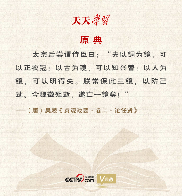 “以史為鑒,可以知興替”,最早應(yīng)出自唐代史學(xué)家吳兢的政論性史書《貞觀政要》:“夫以銅為鏡,可以正衣冠;以古為鏡,可以知興替;以人為鏡,可以明得失。”這是唐朝第一諍臣魏徵去世后,唐太宗對朝臣發(fā)出的感慨之言!杜f唐書·魏徵傳》抄錄此語。后來,歐陽修、宋祁所編《新唐書·魏徵傳》對此略作修改:“以銅為鑒,可正衣冠;以古為鑒,可知興替;以人為鑒,可明得失。”這句話的意思是,用銅作鏡子,可以端正衣冠;用歷史作鏡子,可以知道歷代興亡更替的規(guī)律;用人作鏡子,可以明了自身的得失。