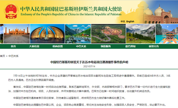 巴基斯坦發(fā)生爆炸致9名中方人員遇難 中國(guó)駐巴使館發(fā)布聲明