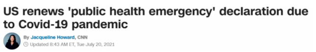 由于新冠病毒德爾塔變異株加速蔓延和疫苗接種推進受阻導致多地疫情反彈,美國衛(wèi)生與公眾服務部日前宣布自當?shù)貢r間20日起,將去年1月以來美國一直在實施的“公共衛(wèi)生緊急狀態(tài)”再次延長90天。