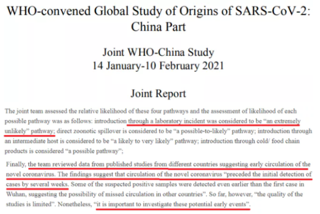 △根據世衛(wèi)組織溯源報告得出的結論,新冠病毒“極不可能”通過實驗室傳人;需要進一步調查世界其他地方出現(xiàn)的早期陽性樣本。