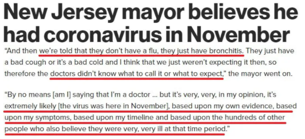 ——“根據我自己的證據、癥狀和病情發(fā)展,以及其他數(shù)百人也表示他們在那個時期病得非常非常厲害的事實,新冠病毒極有可能已經在11月出現(xiàn)!