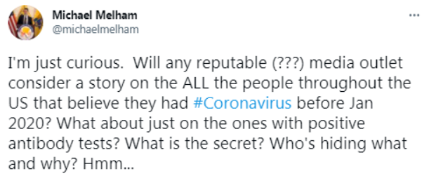 梅爾哈姆公開自己的遭遇后收到了很多有同樣經歷者的郵件。他在社交媒體上呼吁負責任的媒體對這些被忽略甚至被隱瞞的早期可疑病例進行追蹤報道!澳切┰缇蜋z測出抗體的人在哪里?誰在隱瞞什么?為什么要隱瞞?”