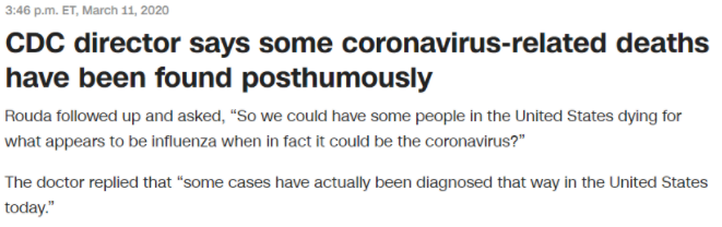 去年3月11日,當時的美國疾控中心(CDC)主任雷德菲爾德在國會眾議院一次聽證會上就承認,美國確實有原本被診斷為流感、實際上卻是因為感染新冠病毒而死亡的病例。