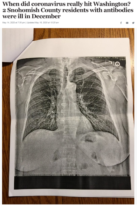 △《西雅圖時報》報道截圖(題圖中的X光片顯示其中一位斯諾霍米什縣居民的肺部“過度充氣”并出現(xiàn)“線性混濁”。醫(yī)生認為,這可能是疊加上呼吸道肺部感染的表現(xiàn)。)