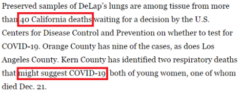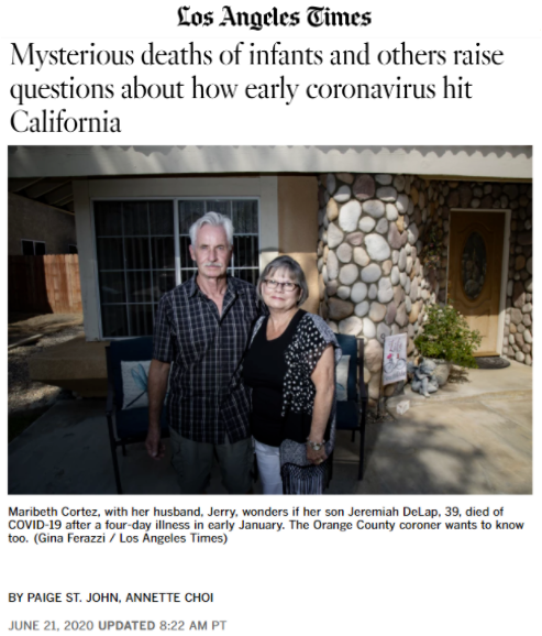 《洛杉磯時報》去年6月21日報道稱,加利福尼亞州最早可追溯至2019年12月的40余起不明死亡病例或將改寫新冠肺炎疫情在美國的時間線。