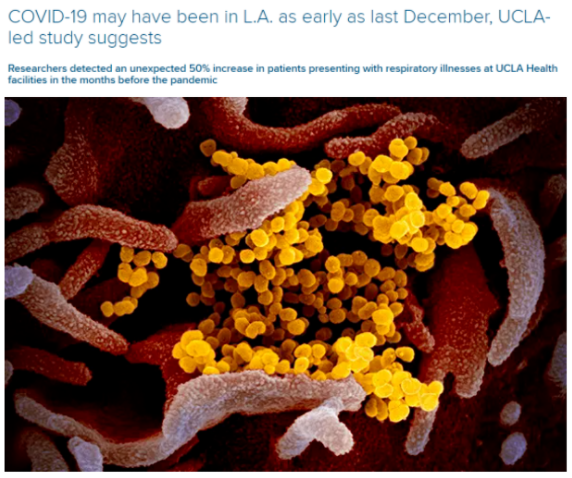 加州大學洛杉磯分校去年9月10日宣布,該校與華盛頓大學合作研究發(fā)現(xiàn),從2019年12月下旬開始并持續(xù)到2020年2月的呼吸道癥狀和疾病患者數(shù)量明顯增加,表明新冠病毒在具有臨床意識和檢測能力之前就已經在美國的社區(qū)傳播。