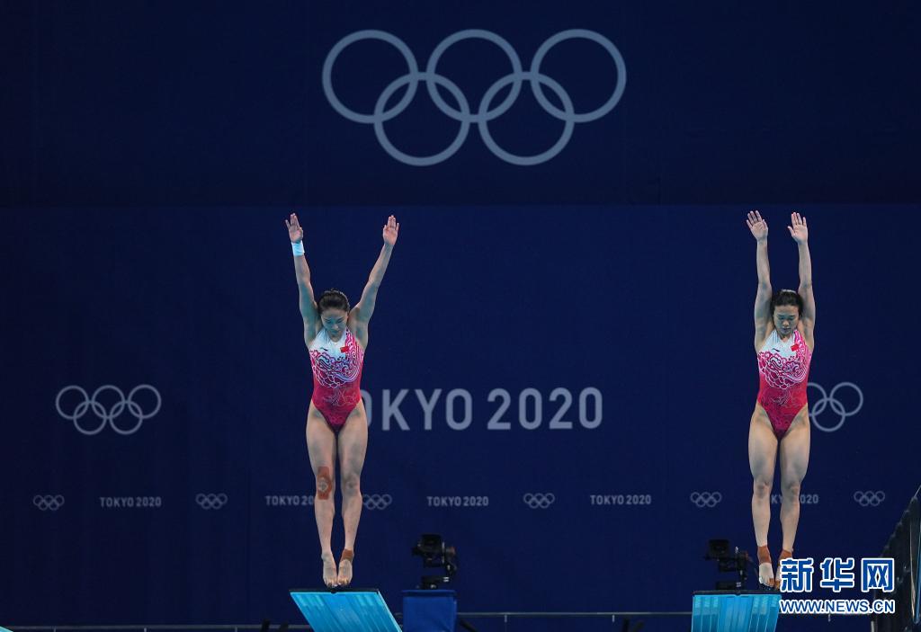 7月25日,中國選手施廷懋(右)/王涵在比賽中。當(dāng)日,東京奧運(yùn)會(huì)跳水女子雙人三米跳板決賽在東京水上運(yùn)動(dòng)中心舉行。新華社記者 許暢 攝