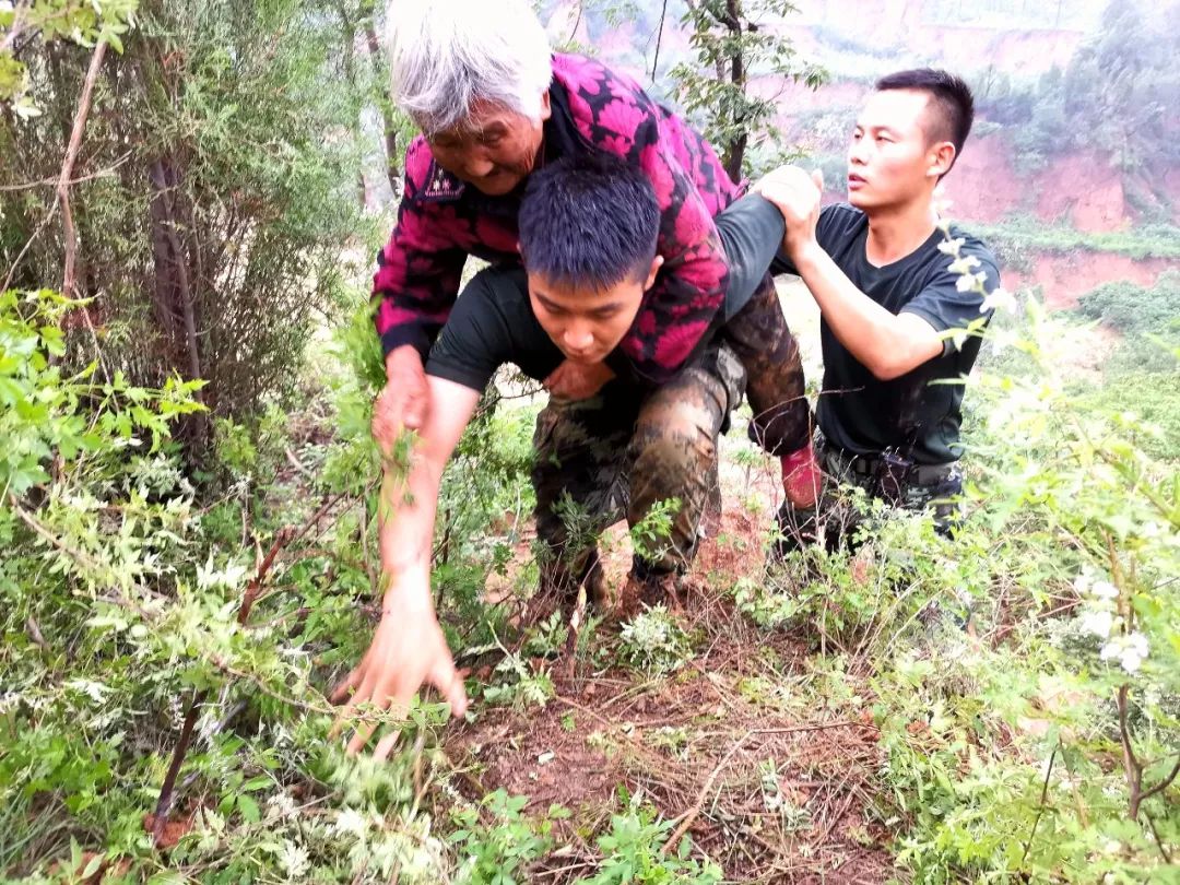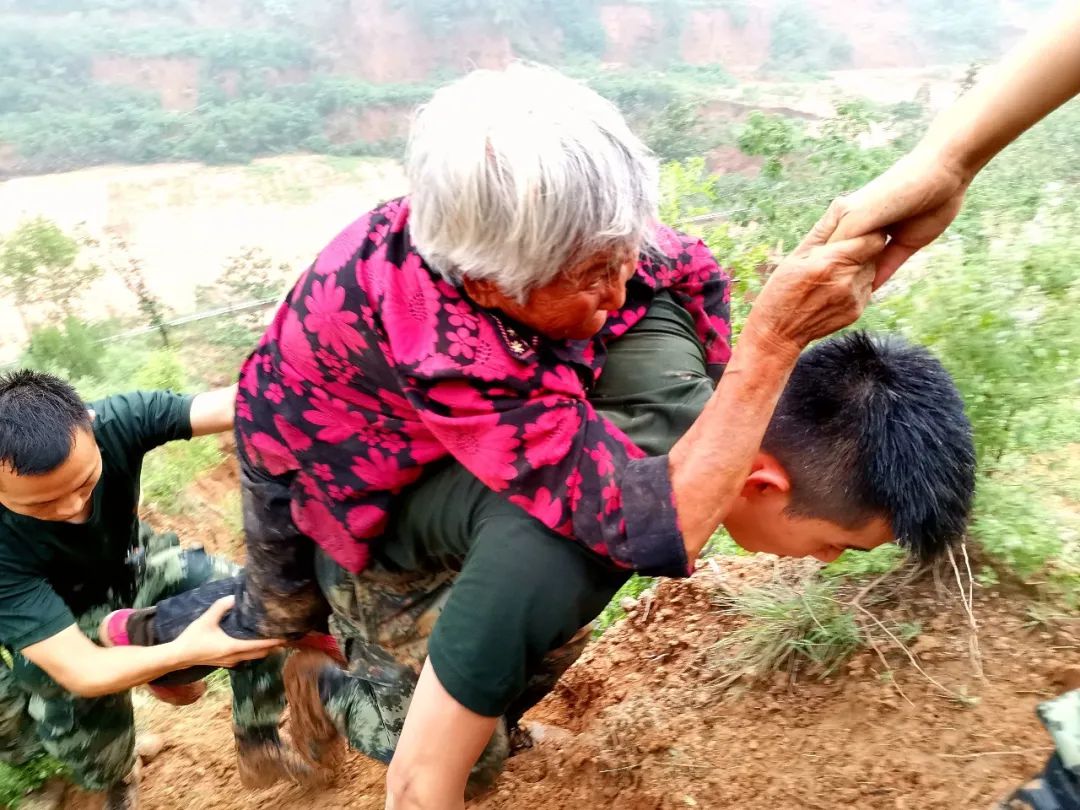 年輕的武警戰(zhàn)士用力地彎下腰來,肩背穩(wěn)穩(wěn)地托起白發(fā)蒼蒼的老人,手腳并用艱難地在泥濘的山路跋涉。