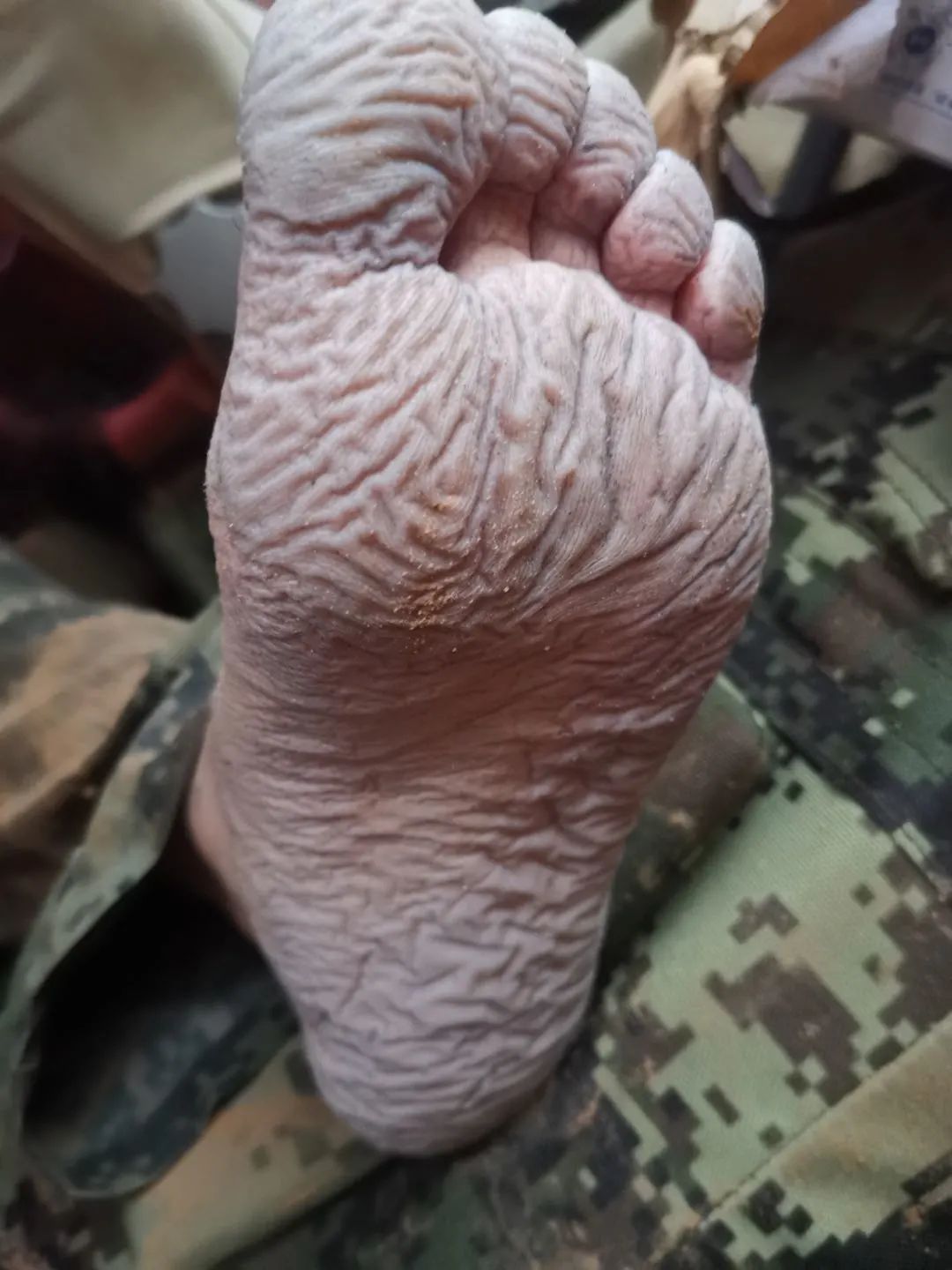 這是一雙在洪水中連續(xù)奮戰(zhàn)的老班長的腳,這雙腳被積水浸泡得發(fā)白、皸裂。
