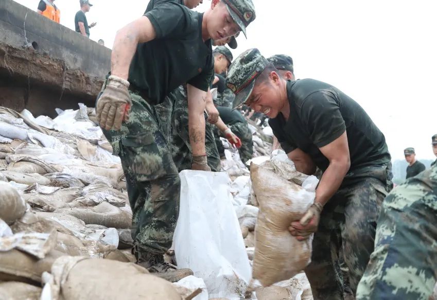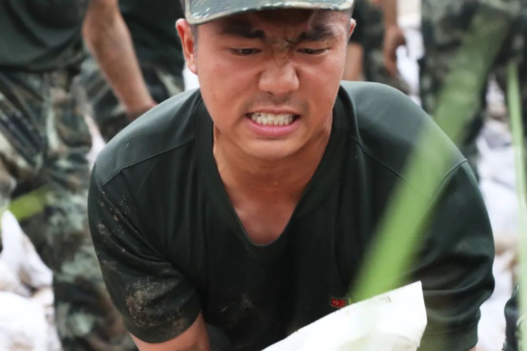 這是一張“00后”士兵的臉,大堤上,他咬緊牙關(guān),眉頭緊鎖,低下身子,吃力地舉起沙包往肩上送。那張黝黑的臉憋得通紅,汗水順著脖子往下淌,軍裝早已濕透。