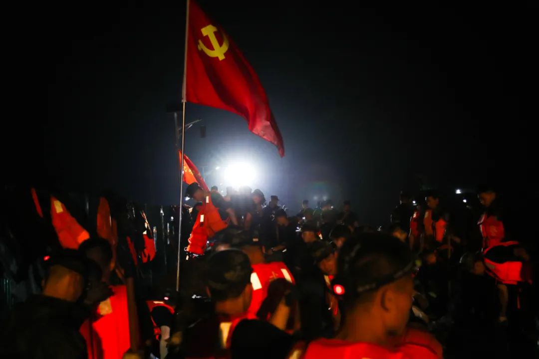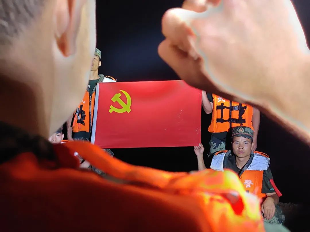 這是一場特殊的出征儀式?购榈拇蟮躺希鎸︴r紅的黨旗,一群擔(dān)負突擊任務(wù)的官兵們,拳頭緊握,向黨宣誓,朝著洶涌的洪水,堅定地走去。