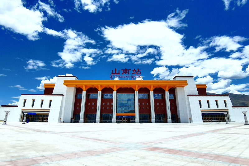 山南站和林芝站是兩個大站,站房面積均為1.5萬平方米,最高峰均可容納2000人同時候車。山南站設(shè)有2座站臺、5條到發(fā)線,其設(shè)計理念源于西藏第一座宮殿——雍布拉康,充分彰顯“人文山南”的理念。車站外挑檐廊立柱,內(nèi)嵌藏紅色線條柱腳,增加石刻吉祥結(jié)圖案,候車大廳吊頂采用藻井與吉祥結(jié)相融合的設(shè)計,完美詮釋“藏之源、山之南、河之畔、湖之藍(lán)”的山南印象。